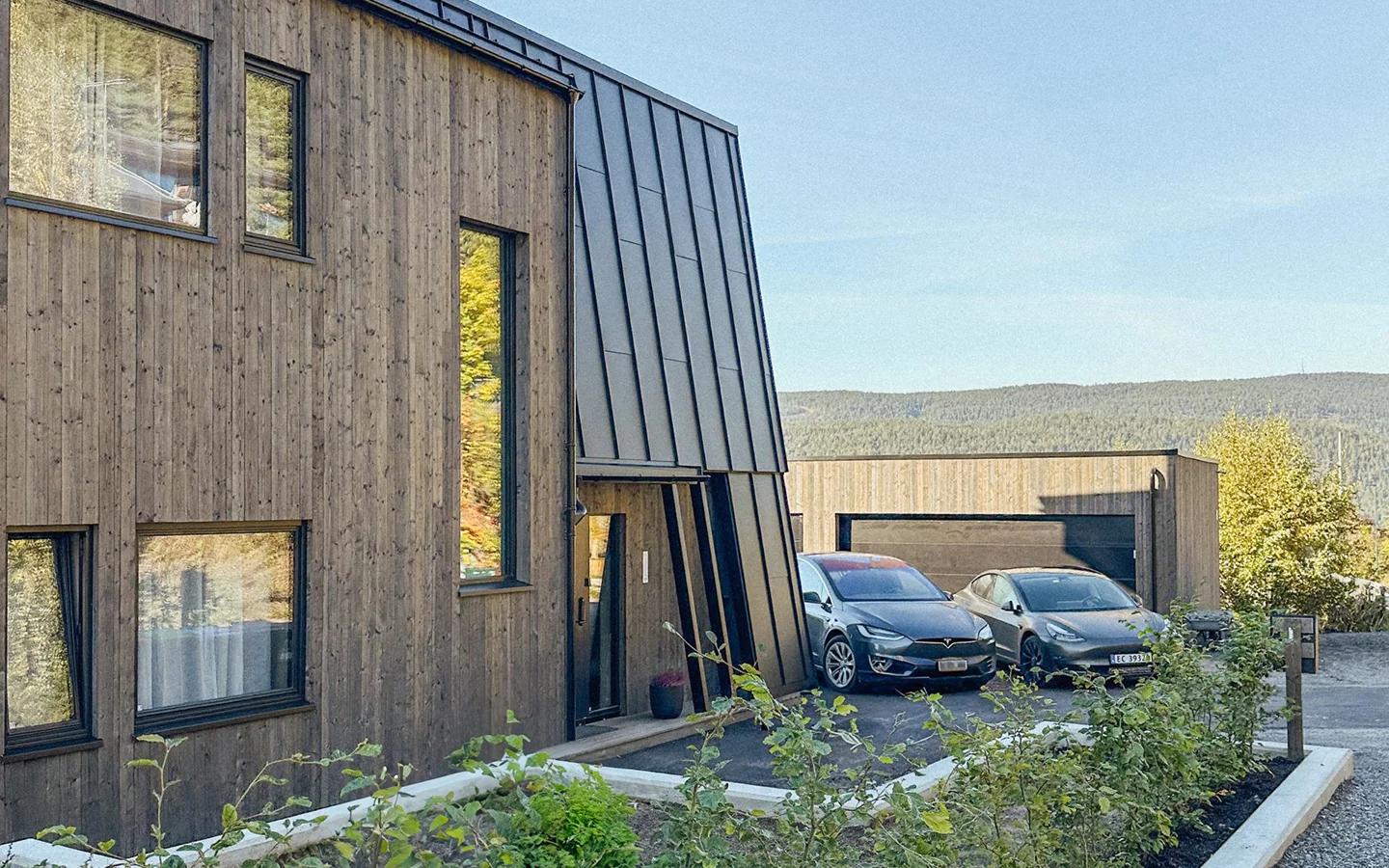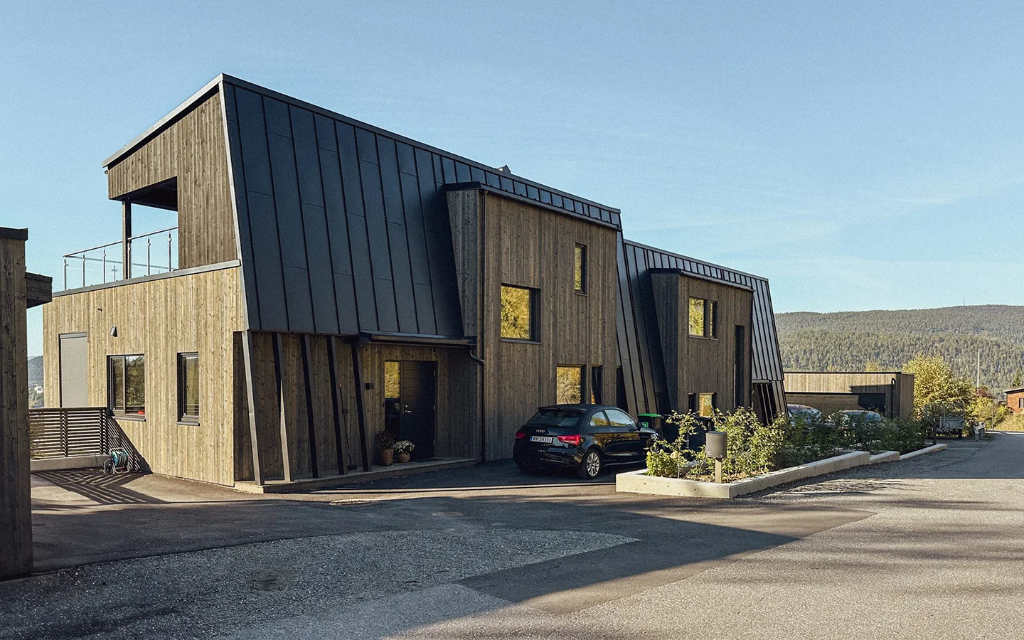 En moderne tomannsbolig i Daniel Barths vei i Kongsberg, tegnet av Friis Arkitekter.